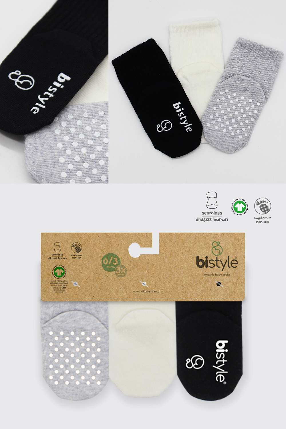 جوارب عضوية عضوية مانعة للانزلاق من بيستايل 3 أزواج (0-3 م) (أسود، رمادي، بيج)