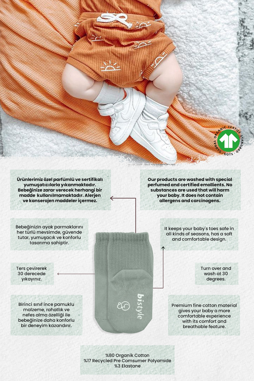 مادة متينة: مقاومة قوية للتآكل، ومقاومة ممتازة للتكوير. تتميز جوارب الأطفال Die Babysocken haben eine hohe Elastizität، keine Verformung، مما يفقد الأطفال الصغار ثبات اللون. ثبات جيد للألوان، غسيل يدوم طويلاً، لا يبهت، لا يوجد عامل فلوري، لطيف على البشرة، غير مهيج.” نوع القماش80% قطن 80 % قطن / 17 % نايلون / 3 % إيلاستين