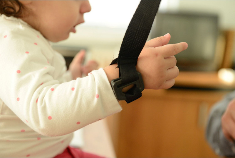أدخلي الحزام كما هو موضح. اضبطي أحزمة الكتف على الطفل. أدخلي الخطاف كما هو موضح. ضعي الحلقة على معصم الطفل مع الحرص على ألا تكون ضيقة جداً. للأطفال من عمر 10 أشهر فأكثر، أقل من 20 كغم. طريقة رائعة وآمنة لإبقاء الأطفال قريبين وآمنين في الزحام.
