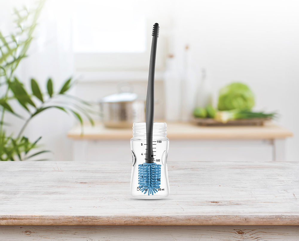 سيتم تنظيف رضّاعات طفلك بكفاءة، عندما تقومين بتدوير شعيرات السيليكون طويلة الأمد الموجودة بداخلها على الرضّاعات، بحيث تصل إلى كل الأسطح. ستكون الحلمات نظيفة عندما تقومين بتنظيف بقايا الطعام برفق بالجانب الخلفي للفرشاة.