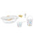 The babyjem bath set, which is offered for sale in a stylish gift box, includes 1 large bath tub with drain, 1 bath bucket, 1 mug, 1 bath net, 1 rubberized baby wash sponge and 1 bath thermometer.