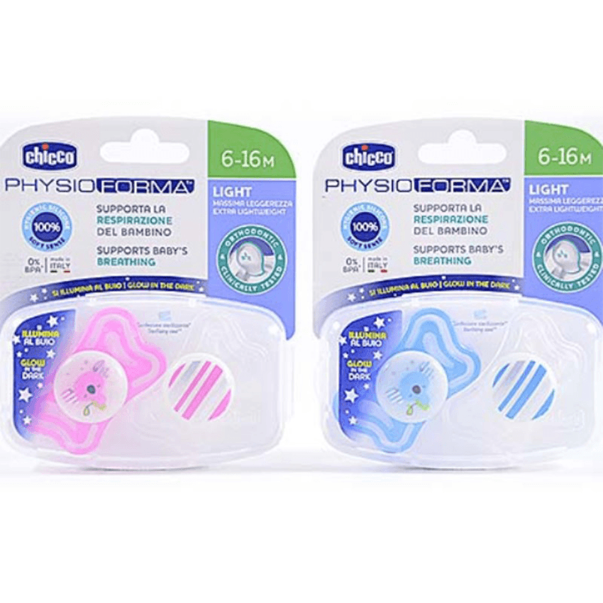 Physio Light is Chicco’s extra light pacifier with large ventilation holes to prevent the accumulation of baby’s saliva. So your delicate skin is not irritated, and the pacifier is so light that you will not feel any discomfort. With a hygienic silicone nipple, it does not deform and its finish is very soft and pleasant. All Chicco pacifiers are PhysioForma: developed to help position the tongue forward and thus favor the baby’s physiological breathing .