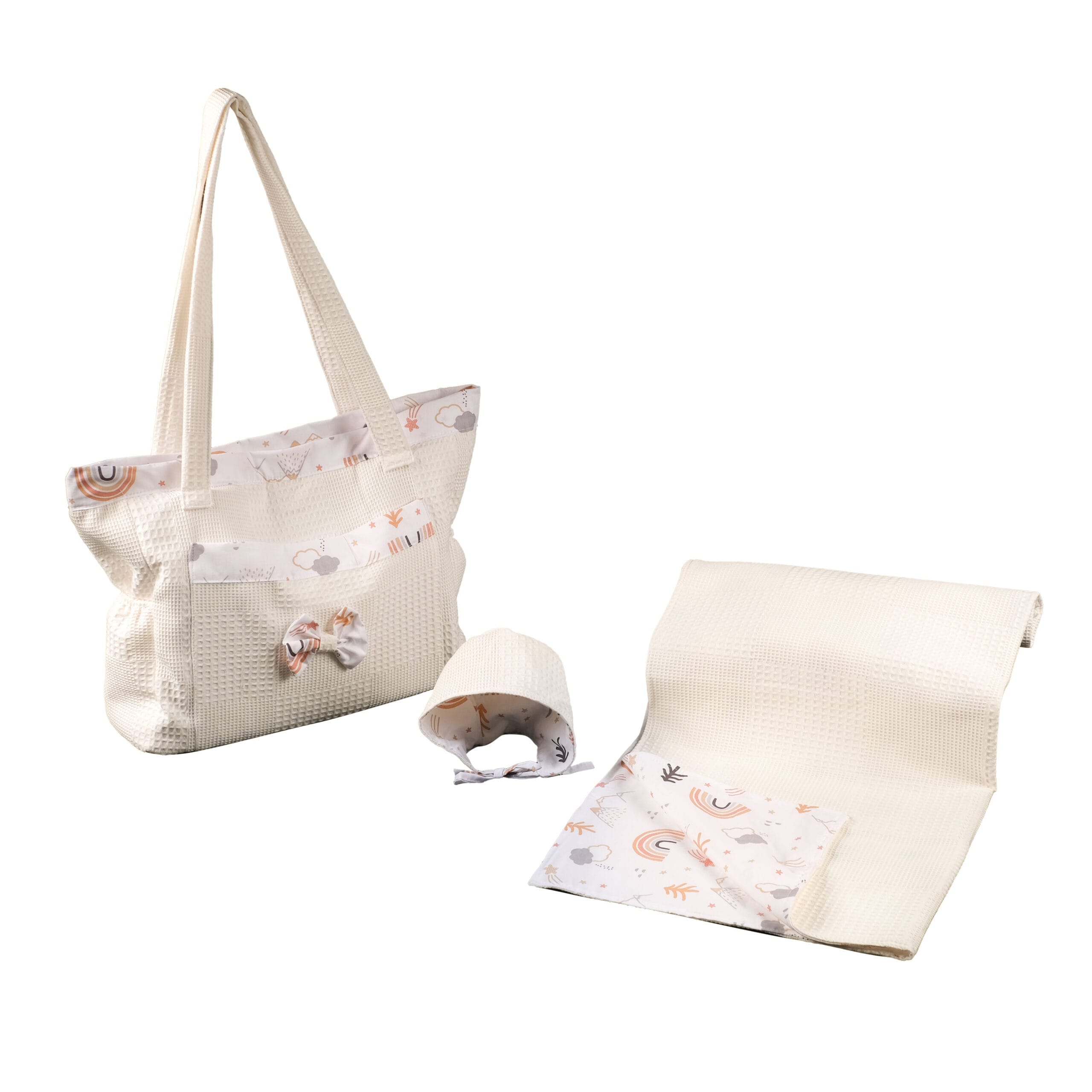 - 3 pieces including: soft blanket, Mother bag Diaper, and hat.