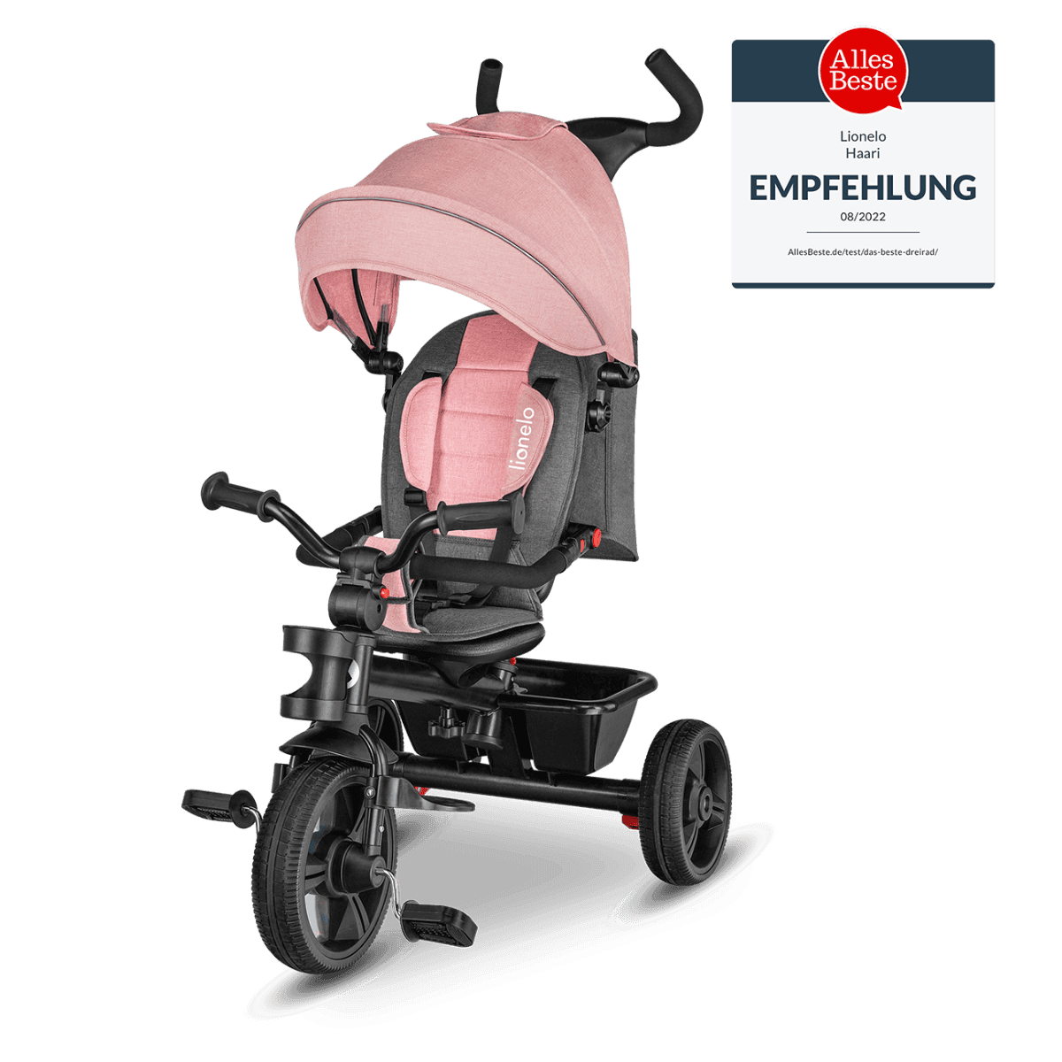 Security of riding is provided by 3-point belts with covers and a soft bow covered in a high-quality foam. The product is equipped with anti-skidding pads on the handlebars and fluorescent elements on the sunshade, thanks to which the tricycle is better visible. The product also comes with 2 brakes on the rear axle. Haari tricycle has undergone a multi-stage verification and tests in the independent certifying laboratory – Intertek. It meets requirements of the European security standard – EN 71.