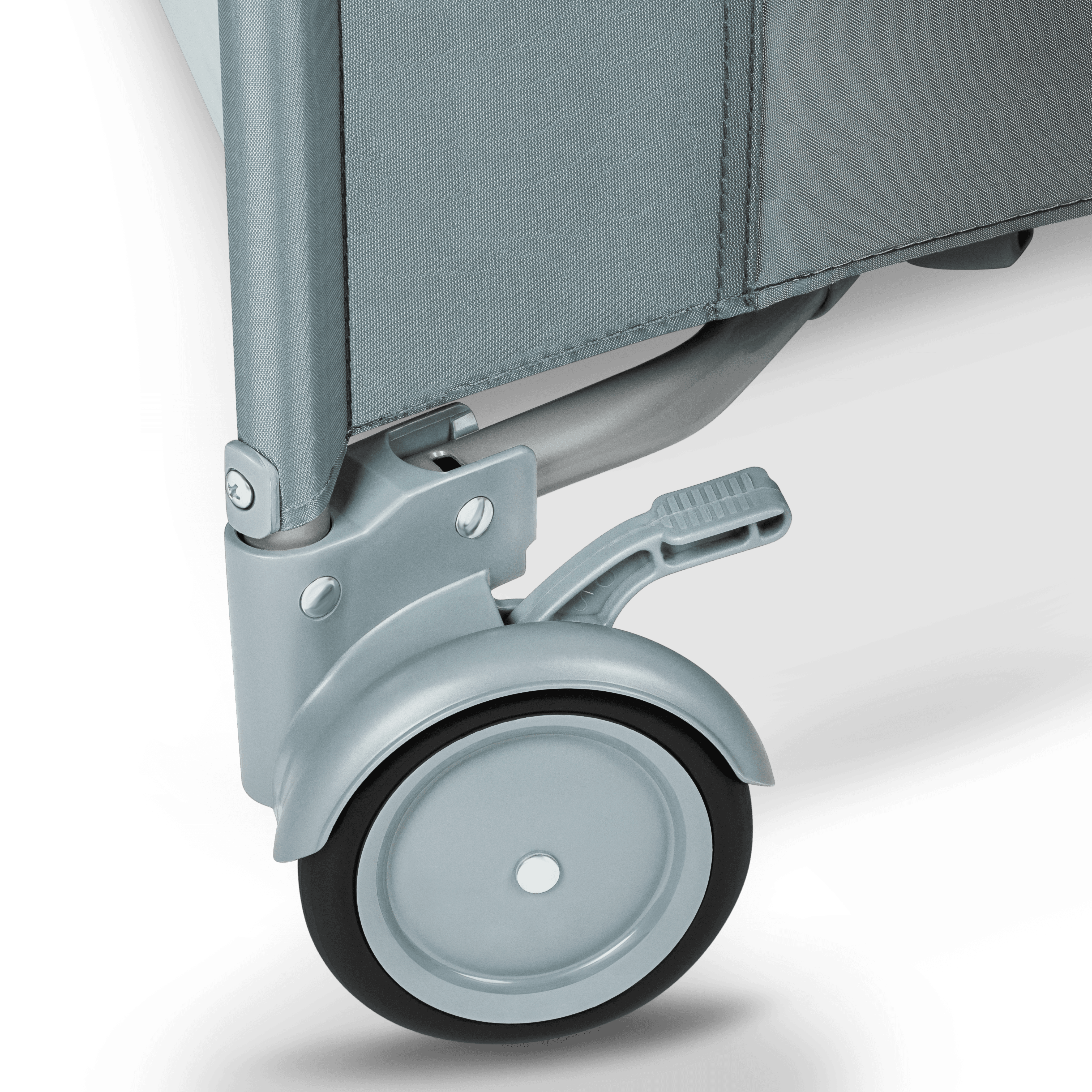 The playpen comes with 2 wheels for smooth movement on the floor. In order to secure the child against uncontrolled movement while playing, the solid wheels lock can be activated.
