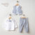 Includes a long-sleeved shirt, beige-toned vest, and classic ivory trousers for a sophisticated baby look.