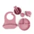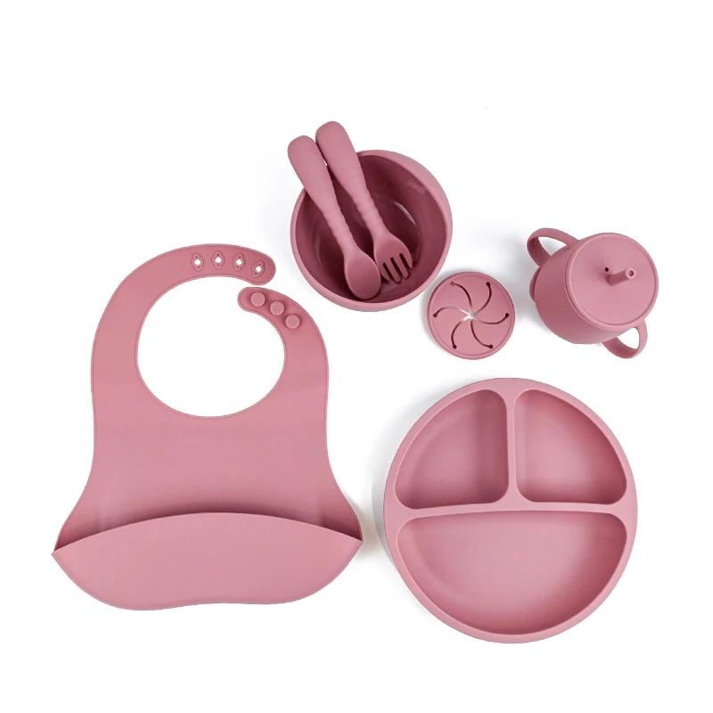 Bib, Suction Divided Plate, Suction Bowl, Spoon, Fork, Sippy Cup with straw and lid and Snack Cup lid.