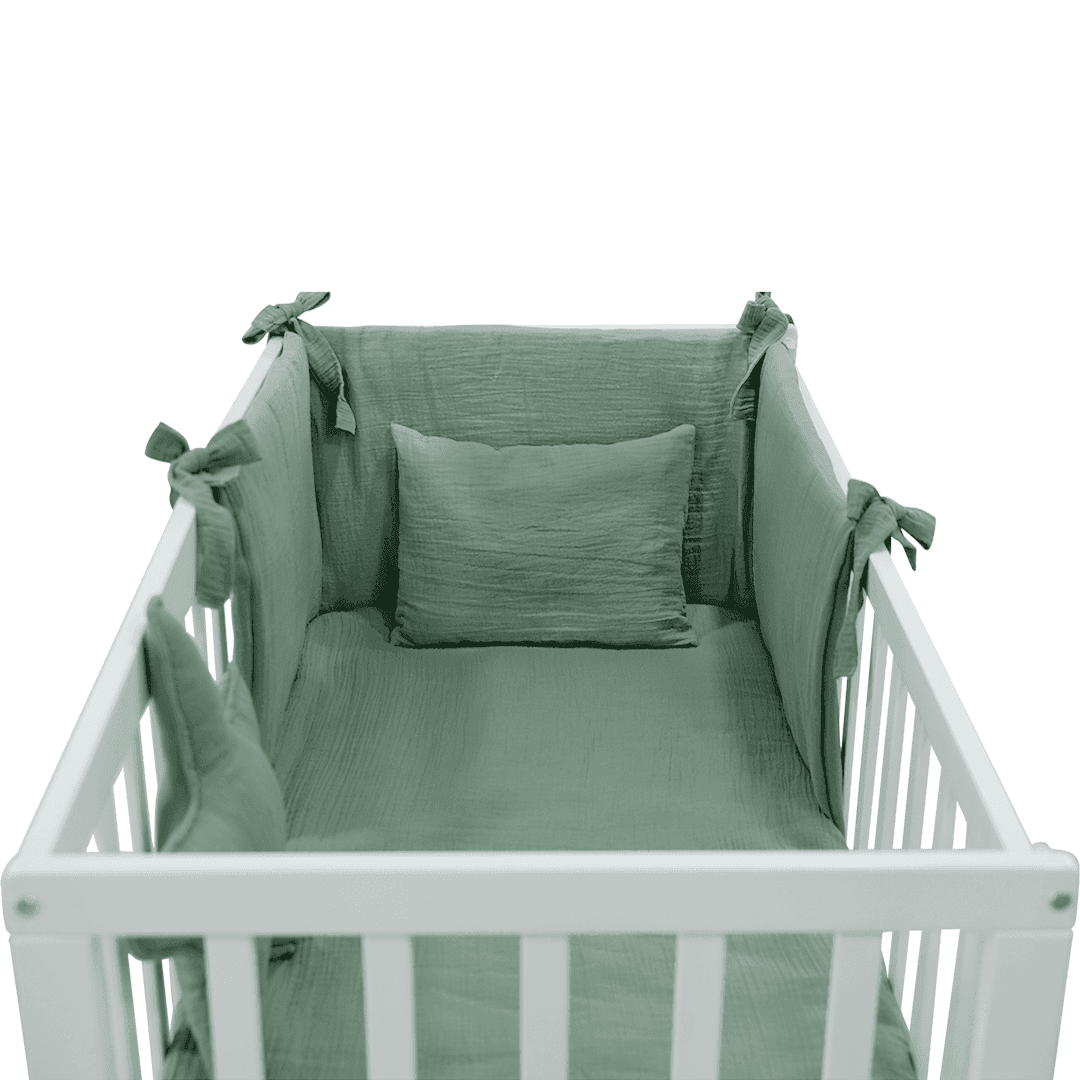 - 8-piece crib bedding including: 3 Sides bumper, 1 Sleeping pillow, 1 Pillowcase, 1 Decoration Cushions, 1 fitted sheet, and 1 blanket.